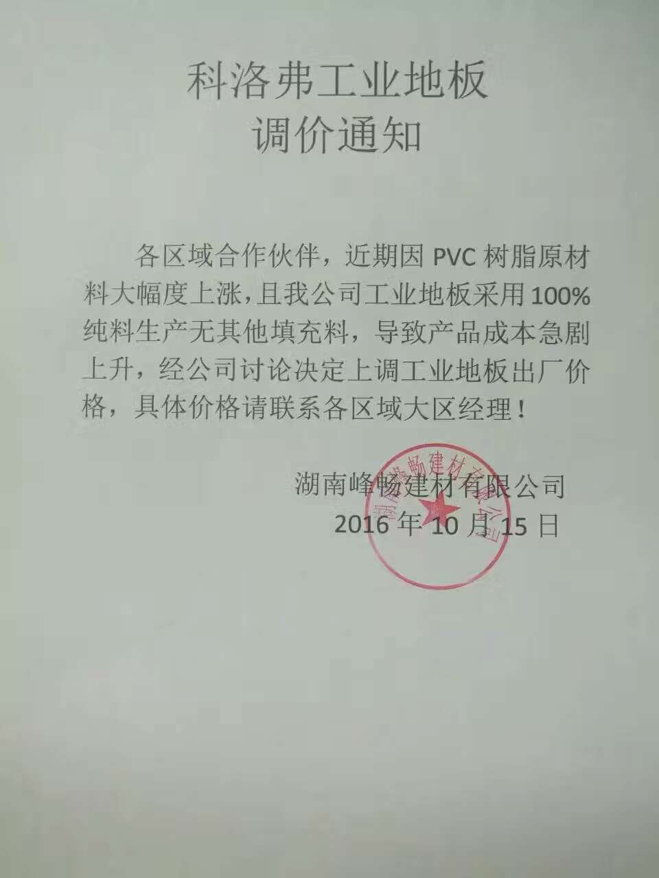 科洛弗工業(yè)地板調(diào)價(jià)通知
