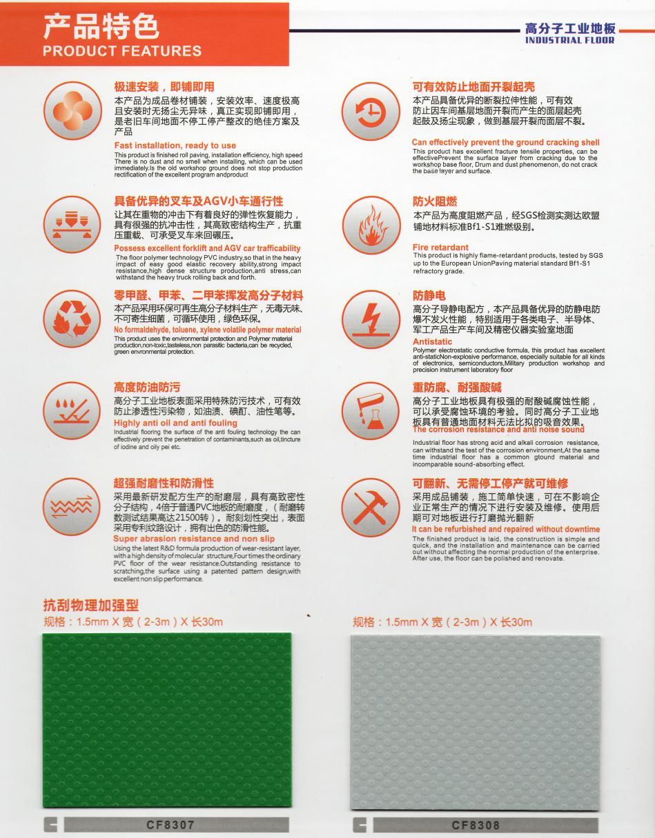 10 超強耐磨:在人流量較大的醫院、學校、辦公樓、商場、超市、交通工具等場所,尤其是要求嚴格的工業地面,高分子工業地板越來越受到歡迎。
